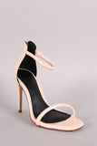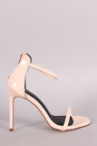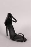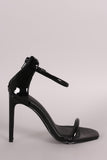 This open toe heel features a glossy patent upper, single strap across vamp, ankle strap with a partial elastic insert, and wrapped stiletto heel. Finished with lightly padded insole and convenient back-zip closure.