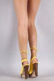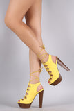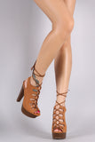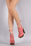 This eye-catching heel features a strappy cutout design with button detail, corset lace up closure, slingback strap, open toe silhouette and chunky platform heel. Finished with a lightly padded insole for comfort.