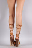 This stunning lace up closure, peep toe silhouette, tribute platform, chunky stacked heel, and lightly padded insole for comfort.