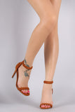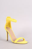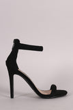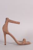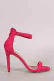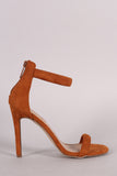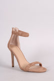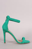 This simply alluring heel features an open toe silhouette, one band across vamp, fixed ankle strap, and wrapped stiletto heel. Finished with lightly padded insole and back-zip closure.
