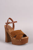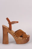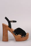 This retro-inspired clog heel features a peep toe silhouette, faux wooden platform, metal stud details, and chunky heel. Finished with lightly padded insole and adjustable ankle strap with buckle fastening.