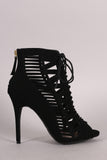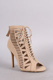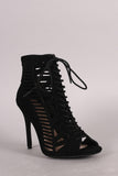 These fashionable booties feature a peep toe silhouette, caged cutout design vamp with lacing detail, and wrapped stiletto heel. Finished with lightly padded insole and rear zipper closure for easy on/off.