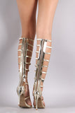 This gladiator heel, featuring elasticized sides and an adjustable back zipper. Designed with an ornament along the front. Finished on a stiletto heel.