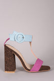 This open toe heel has a t strap, featuring an adjustable ankle strap, round buckle, color blocking. On a chunky stacked cork covered heel.