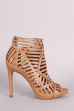 This peep toe heel features a geometric cutout design, stitching accents, and wrapped stiletto heel. Finished with lightly padded insole and back-zip closure.