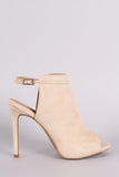 These booties feature a peep toe silhouette, back cutout design with buckle strap closure, wrapped stiletto heel, and cushioned insole for comfort.