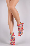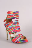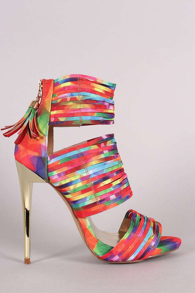 This striking heel features a kaleidoscope print fabric, strappy construction with stitched trims, and open toe silhouette. Finished with a lightly padded insole, metallic stiletto heel, and tassel back-zip closure.