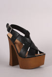 This retro-inspired peep toe heel features a crisscrossing woven straps design at front, chunky faux wooden platform heel, lightly padded insole, and slingback strap with adjustable side buckle fastening.