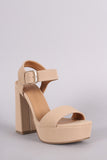 This heel features an ankle strap with adjustable buckle closure, open toe silhouette, chunky heel, and wrapped platform. Finished with lightly padded insole for comfort.