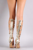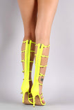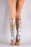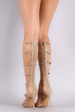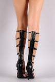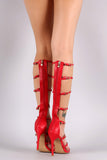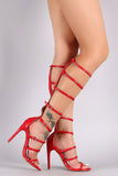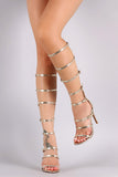 This heel features a vegan leather upper, strappy construction with buckles, open toe silhouette, and wrapped stiletto heel. Finished with a lightly padded insole and rear zip-up closure for easy on/off.