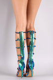 This heel features a snake embossed hologram upper, strappy construction with buckles, open toe silhouette, and wrapped stiletto heel. Finished with a lightly cushioned insole and rear zipper closure for easy on/off.