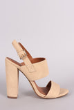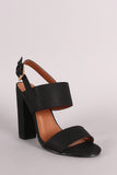 This open toe heel features a chunky wrapped heel, double band construction, lightly padded insole, and adjustable slingback strap with buckle fastening.