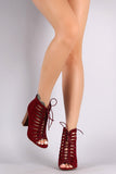 These booties feature a vegan suede upper, lace-up vamp with cutout detail, peep toe silhouette, and faux wooden heel. Finished with a lightly cushioned insole, and rear zip-up closure.