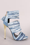 This striking heel features a wash denim fabric, strappy construction with stitched trims, and open toe silhouette. Finished with a lightly padded insole, metallic stiletto heel, and tassel back-zip closure.