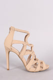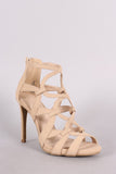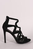 This lovely heel features a strappy caged construction vamp, open toe silhouette, stitching accents, and wrapped stiletto heel. Finished with a lightly padded insole and convenient back-zip closure.