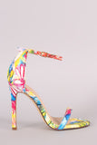 This open toe heel features a paint splash print throughout, single strap across vamp, ankle strap with an adjustable buckle closure, and wrapped stiletto heel. Finished with a lightly padded insole for comfort.