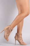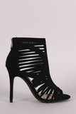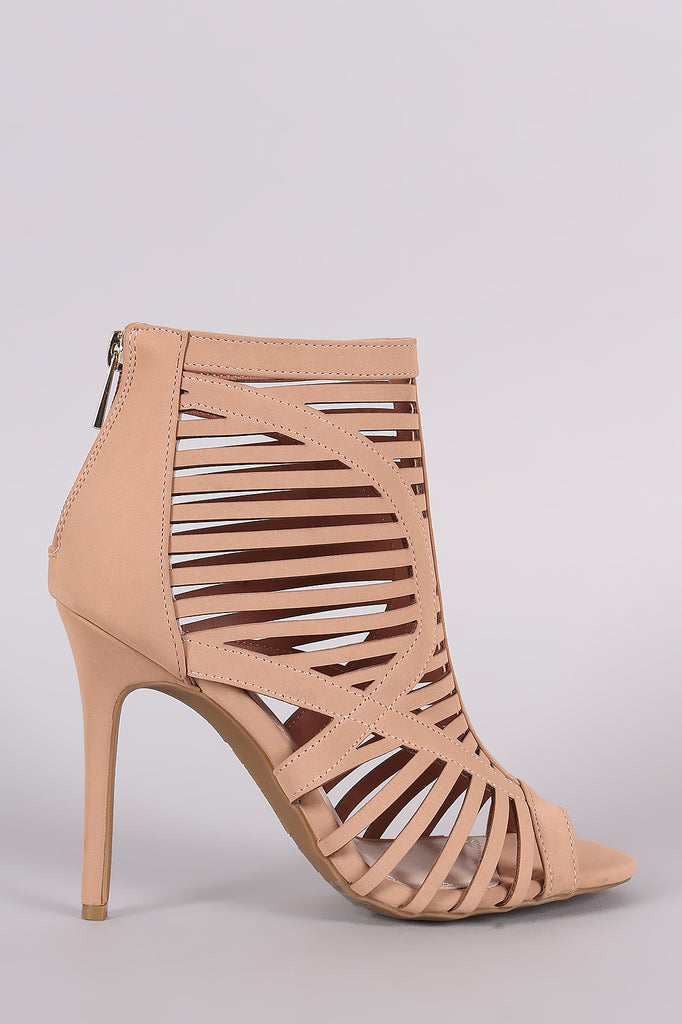 This striking heel features a cage-style silhouette, peep toe, top stitching accents, and wrapped stiletto heel. Finished with a lightly padded insole and rear zipper closure.