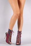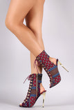 These stylish booties feature a mule silhouette, boho-inspired print, lace up vamp closure, open back, and metallic-finished heel. Finished with a lightly cushioned insole, and side zip-up closure.