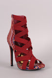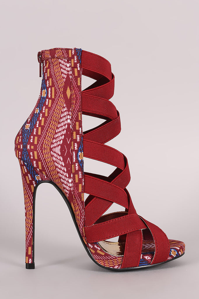 This fashionable heel features a tribal print fabric with elasticized straps design at front vamp, open toe silhouette, low platform, and wrapped stiletto heel. Finished with a lightly padded insole and rear zipper closure for easy on/off.