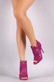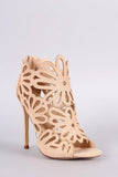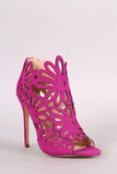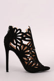 This cutesy heel features a peep toe silhouette, caged construction with floral lasercut design, and wrapped stiletto heel. Finished with a lightly cushion insole and rear zip-up closure.