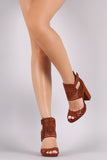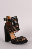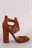 This eye-catching heel features a geometric perforation design, peep toe silhouette, ankle cuff with buckle accent, low platform, and chunky wrapped heel. Finished with a lightly padded insole and convenient back-zip closure.