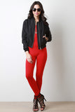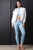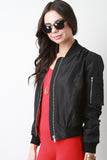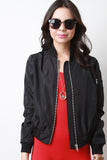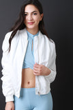 This bomber style jacket features rib knit trim, zip-up front, zipper accent at left sleeve. two pockets, and finished with lining. Accessories sold separately. Outshell: 100% Polyester. Lining: 100% Polyester.