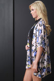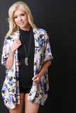 This kimono features a flowy knit fabrication, blue floral print throughout, open front, and short sleeves construction. Accessories sold separately. Made in U.S.A. 100% Polyester.