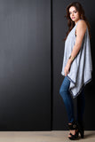 This sleeveless cardigan features a marled knit fabrication, contrasting fringe trim, open front and long asymmetrical hemline. Accessories sold separately.