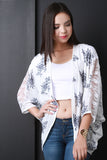 This kimono top features floral embroidery design at front, semi-sheer floral lace back, quarter-length sleeves, and open front. Accessories sold separately. Made in U.S.A. 100% Rayon.