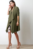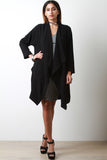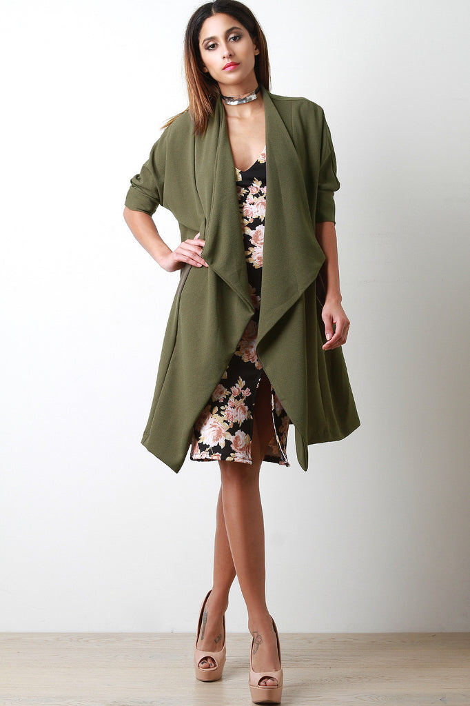 This jacket features a texture knit fabrication, open front, large crepe folded collar, side pockets, and long sleeves. Accessories sold separately. Made in U.S.A. 95% Polyester, 5% Spandex.