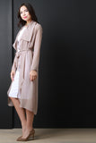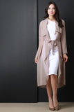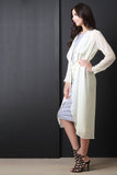 This longline cardigan features a semi-sheer chiffon fabrication, open front with draped design, and long sleeves. Finished with a self-tie sash at waist. Accessories sold separately. Made in U.S.A. 100% Polyester.