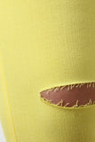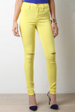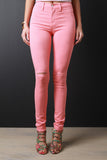 These pants feature knee slits at front, skinny taper cut legs, decor front pockets, rear pockets, belt loops, zipper fly, and a single button closure. Accessories sold separately. Made in U.S.A. 98% Cotton, 2% Spandex.
