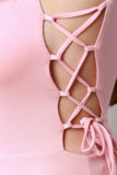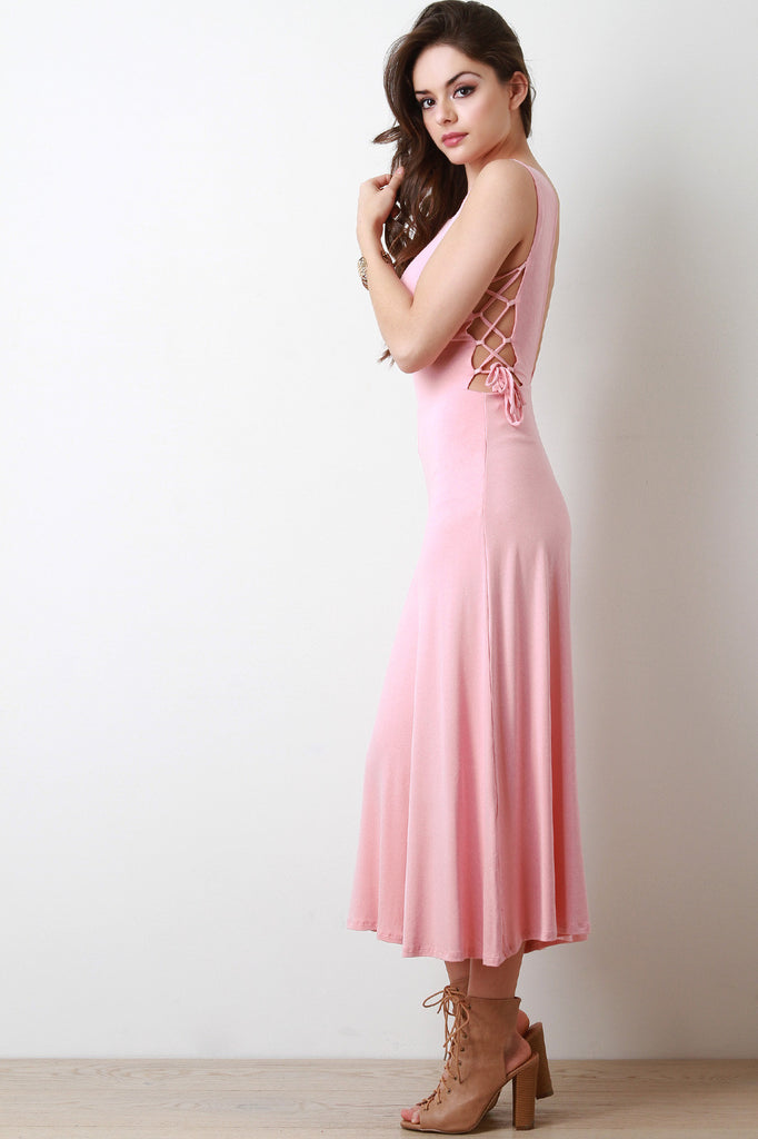 This sleeveless jumpsuit features a round neckline, deep-V back, side corset-style lace-up detail, and wide legs. Accessories sold separately. Made in U.S.A. 95% Viscose, 5% Spandex.