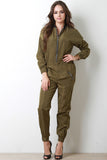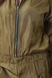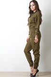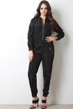 This bomber jumpsuit features a zipper front to a ribbed knit collar, long sleeves, wide elasticized cinched waist, jogger style pants, and side zipper pockets. Accessories sold separately. 100% Polyester.