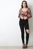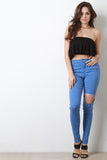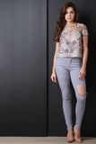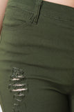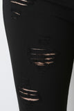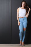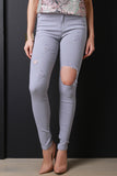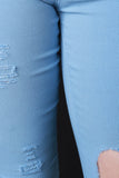 This pair of jeans features stretch denim fabrication, distressed patches detail at front, high waist silhouette, 4-pockets, belt loops and zipper fly with single button closure. Accessories sold separately. Made in U.S.A. 98% Cotton, 2% Spandex.