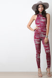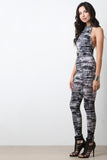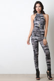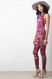 This jumpsuit features a soft knit fabrication, mock neckline, backless halter cut, tapered cut legs. Accessories sold separately. Made in U.S.A. 65% Polyester 35% Rayon.