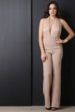This sassy jumpsuit features a deep v neckline, halter top cut, 3 button closure at nape, lace contrast top, high waist cut bottom, pin tuck detailing, flare cut legs, invisible zipper closure at back waist. Accessories sold separately. Self: 100% Polyester. Contrast: 90% Nylon, 10% Cotton.
