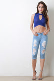 These trendy jeans feature a light wash, stretch denim fabrication, distressed detailing, classic 5-pocket design, capri length hem, with a zipper and single button closure. Accessories sol separately, 80% Cotton, 15% Polyester, 5% Elastane.