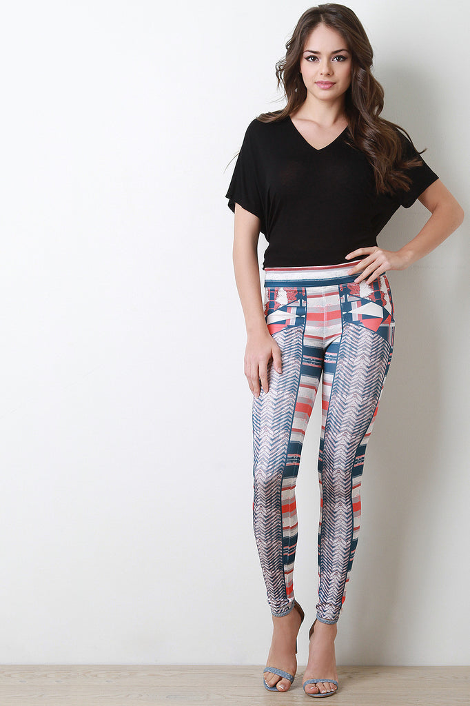These leggings features a wide seam high rise waist, taper cut legs, and geo tribal striped print. Accessories sold separately. 95% Polyester, 5% Spandex. Lining: 100% Polyester.
