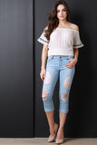 These denim jeans features a low rise waist, belt loops, classic 5-pockets, distress holes at front, and cuff hemline. Accessories sold separately. 82% Cotton, 16% Polyester, 2% Spandex.
