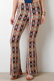 These colorful pants feature a jersey knit fabrication designed with a floral bohemian print, and flared bottoms. Finished with an elasticized waist and high waisted fit. Accessories sold separately. Made in U.S.A. 95% Rayon, 5% Spandex.