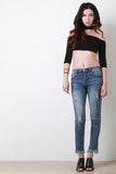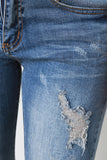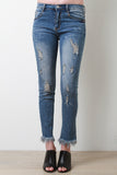 These medium wash denim jeans features a distress front, long fringed hemline, classic 5-pockets design, belt loops, zipper fly, and a single button closure. Accessories sold separately. 98% Cotton, 2% Spandex.