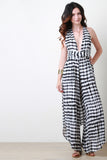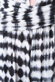 This chic jumpsuit features a lightweight woven fabrication, tie dye print, multi-way self ti infinity top, elastic waist, and flare cut pants with a rounded hem and thigh high slit. Accessories sold separately. Made in U.S.A. 65% Tencil 35% Rayon.