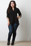 This plus size chiffon top is oversize flowly silhouette. It is v-neck quarter sleeves bodice; buttons are for decor. Accessories sold separately. 100% Polyester.