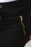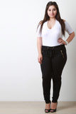 These plus size jogger pants feature soft jersey, a wide elastic waistband with self-tie bow, and contrast color cuffs. Finished with gold-tone metallic zipper pockets. Accessories sold separately. 70% Cotton, 25% Polyester, 5% Spandex.