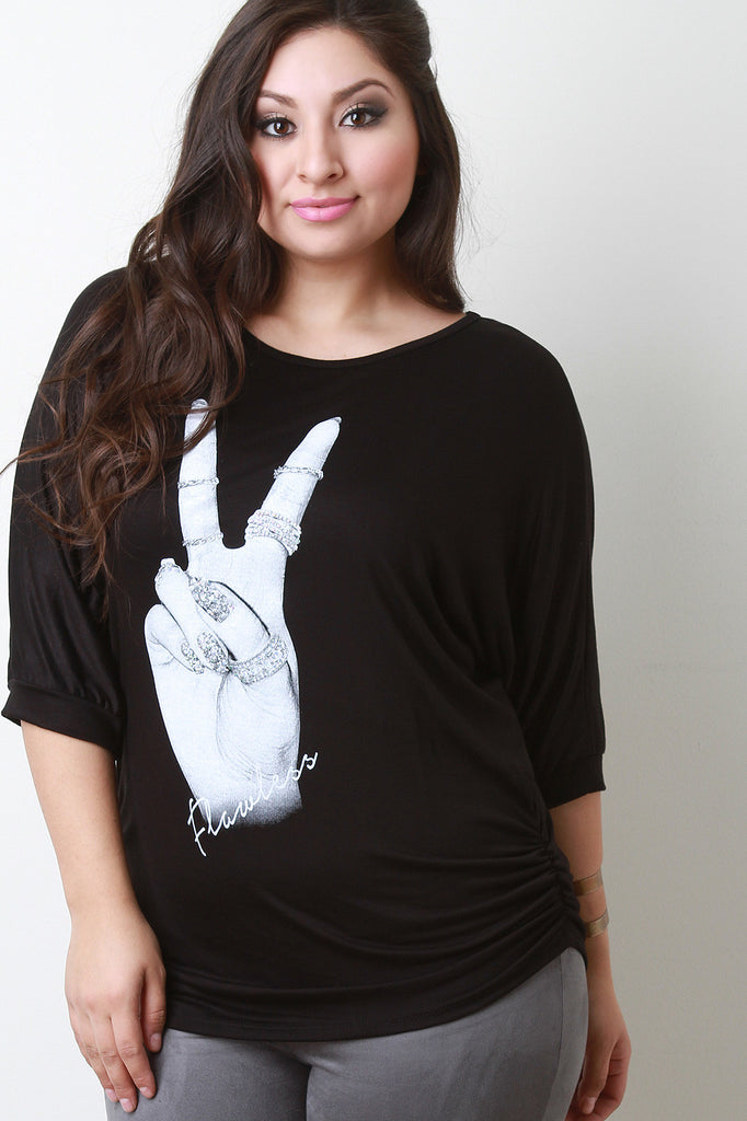 This fashionable  plus size top  features a peace hand gesture print with rhinestone accents at front, round neckline, dolman sleeves design, and side cinched details. Accessories sold separately. Made in U.S.A. 95% Rayon, 5% Spandex.