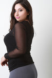 A plus size mesh yoke top featuring a strappy cutout front design, solid main, and long sleeves. Finished with ruched sides and built-in bra. Accessories sold separately. Made in USA. Self: 97% Viscose, 3% Spandex. Contrast: 90% Nylon, 10% Spandex.
