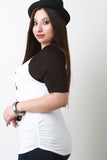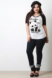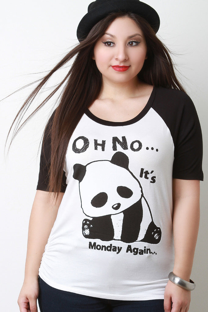 This  plus size tee  features a round neckline, short raglan sleeves, graphic panda with Oh No It's Monday Again print at front, and side cinched details. Accessories sold separately. Made in U.S.A. 97% Rayon, 3% Spandex.