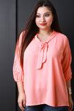This gorgeous plus size blouse features a soft chiffon with semi-sheer floral lace fabrication, round neckline with tie neck, three quarter sleeves, elastic cuff, and curved hem. Accessories sold separately. Made in U.S.A. 100% Polyester. Contrast 92% Nylon, 8% Spandex.