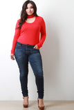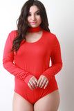 This plus size bodysuit features a jersey knit fabrication, scoop neckline with a wide choker design, keyhole back to a single button closure at nape, long sleeves, brief bottom, and double snap button closure at crotch. Accessories sold separately. Made in U.S.A. 95% Rayon, 5% Spandex.